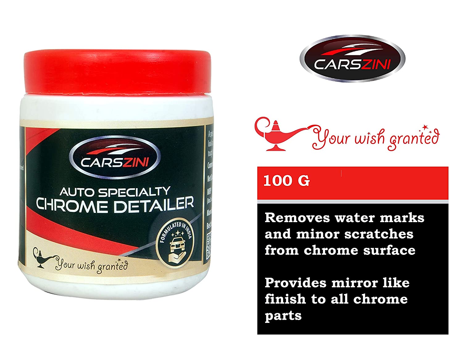 A specialty product for chrome parts in automobiles. Gives a new look and restores shine on chrome surface. Removes oxidation, dirt, tough stains, water marks with ease from chrome surface.